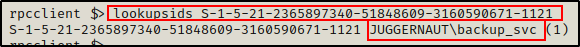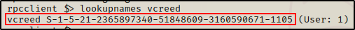 要枚举每个用户的 SID,我们可以使用 lookupnames 命令。