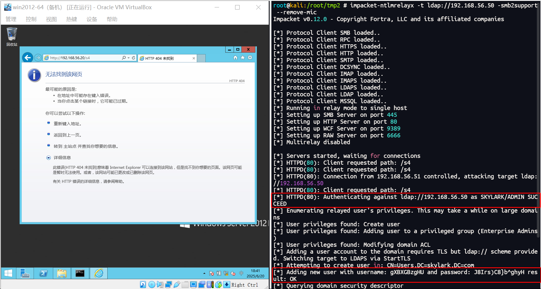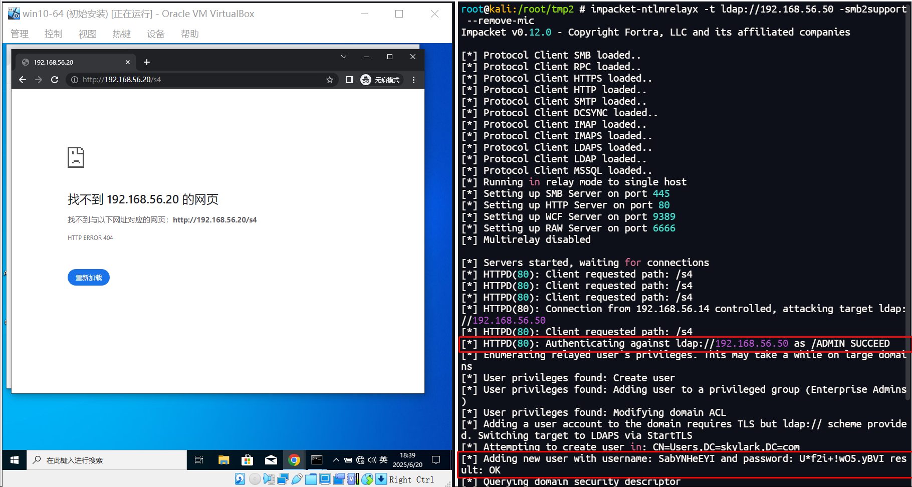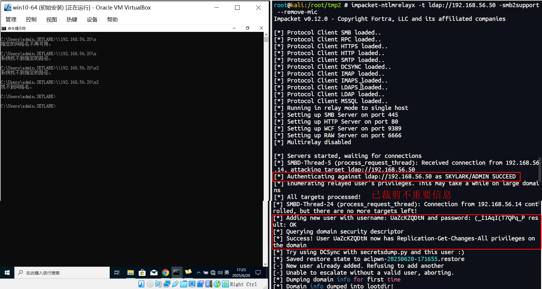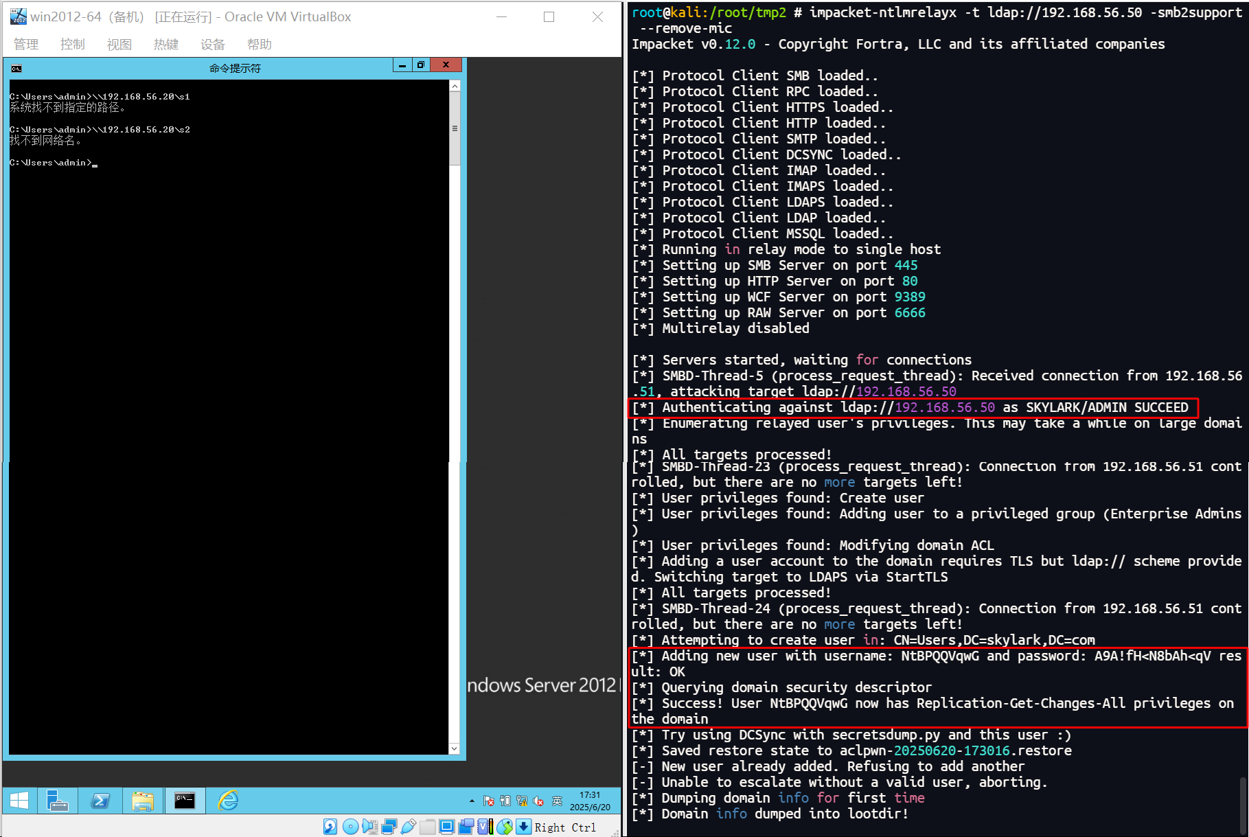 可以看到,当在域主机(Win10)上分别以域管理员 admin 和普通域用户 user 的身份去触发中继认证时,admin 触发的攻击在域控上新建了一个特权账户,而 user 触发的攻击却只是在当前工作目录下转储了一些域中的信息。