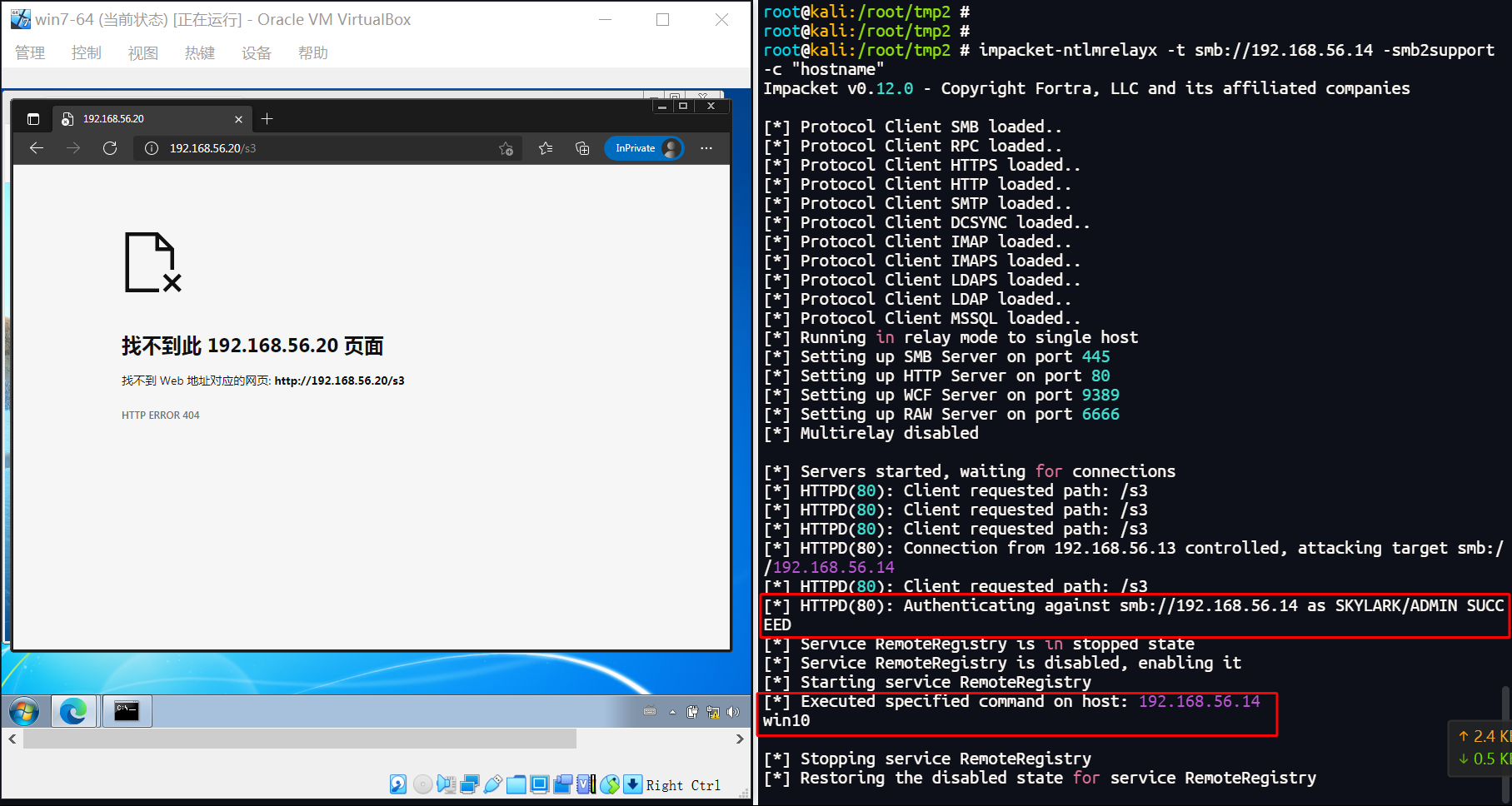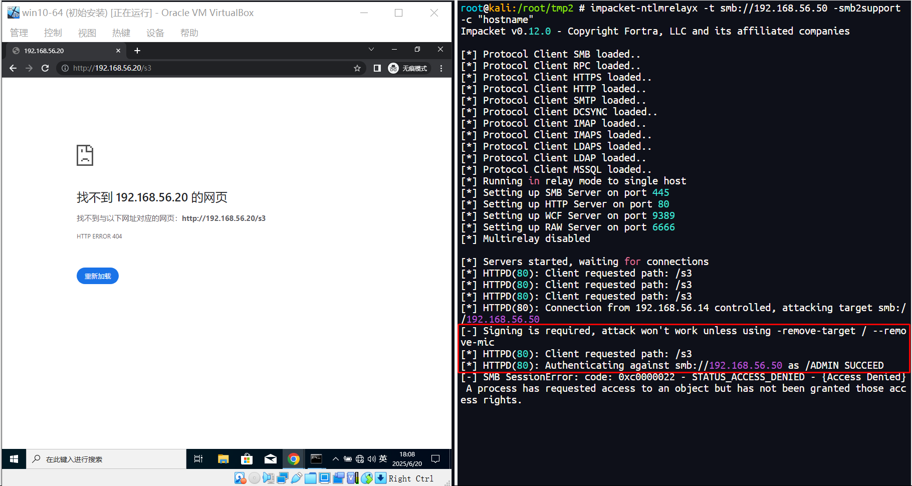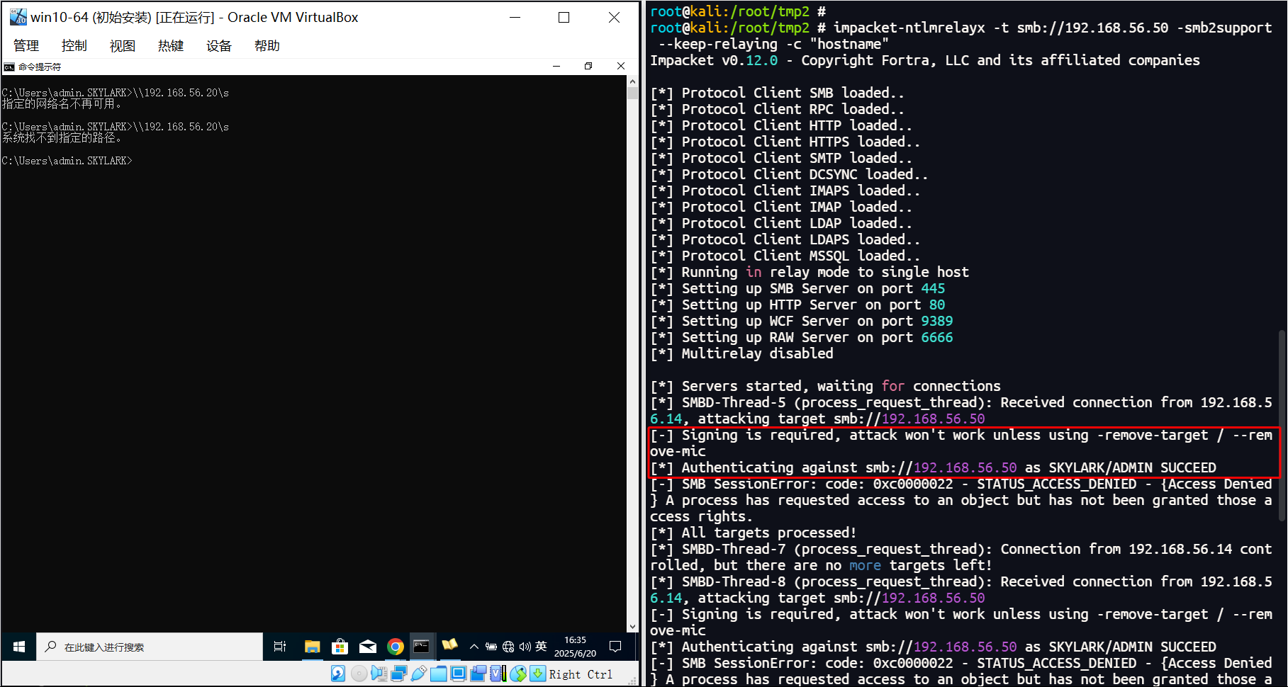 结果:成功!由于被攻击的域主机(Win10)的 SMB 签名处于关闭状态,因此会成功。