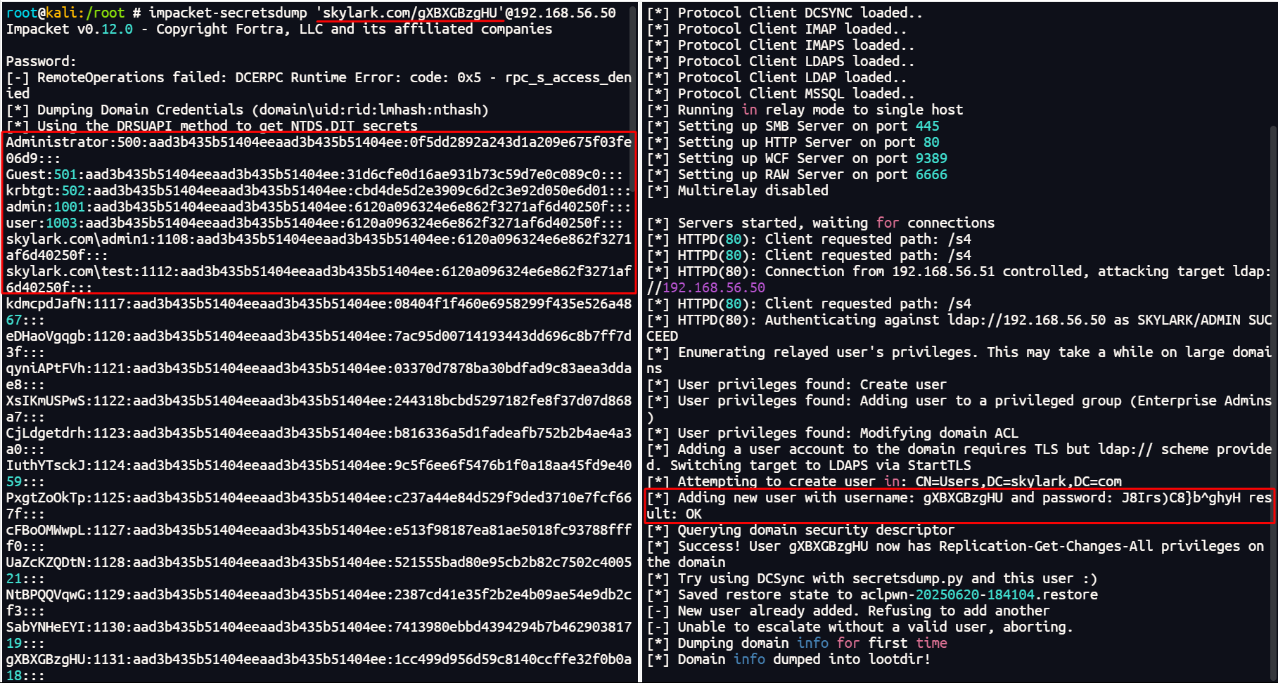 4. 通过 SMB/HTTP 转 LDAP 成功执行时会创建一个拥有 Replication-Get-Changes-All 特权的用户,利用该用户配合 impacket-secretsdump 可成功转储域中所有用户的哈希。
