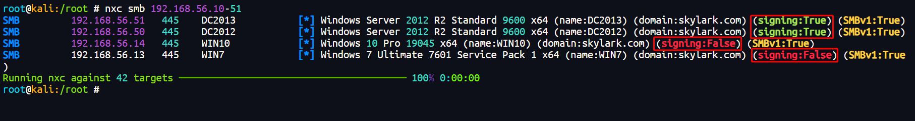 可以看到,在这个域环境中,主备域控均已开启 SMB 签名,而域主机均已关闭 SMB 签名。