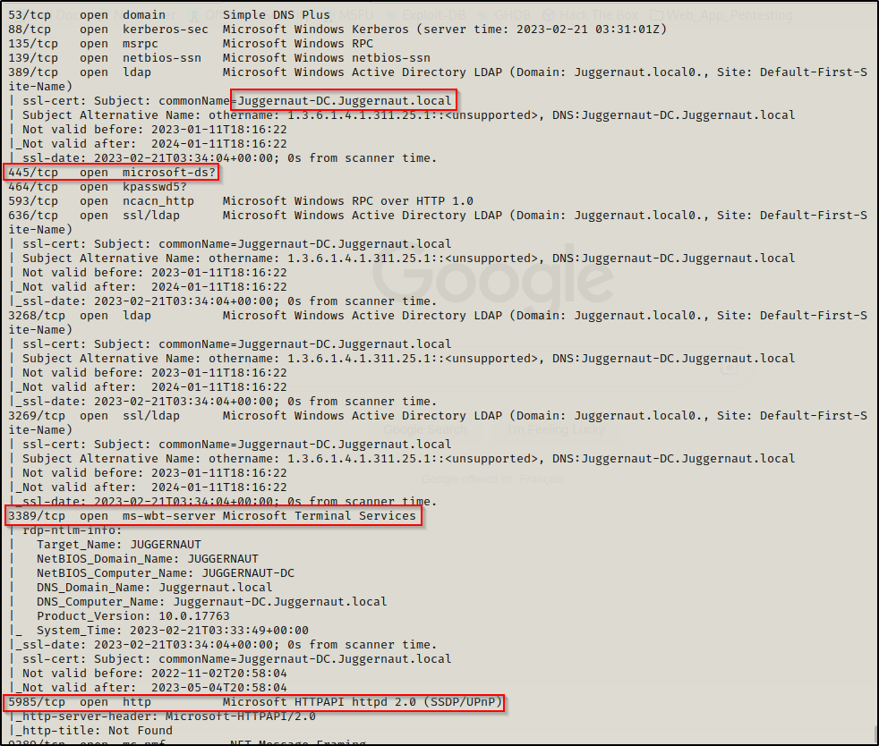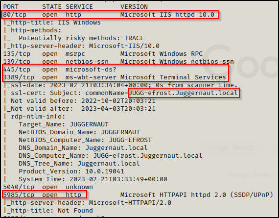 上图是针对 DC 的扫描结果,从结果中可知:该机器的主机名是 Juggernaut-DC,位于 Juggernaut.local 域中,服务 SMB (445)、RDP (3389) 、WinRM (5985) 正在运行。