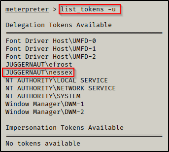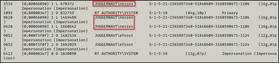 由于已经拥有了 SYSTEM 权限,因此我们可以枚举该机器上保存的任何令牌。而在之前的枚举中,我们发现域管理员 nessex 曾在此机器上登录过,如果足够幸运的话,该令牌应该还在系统中。