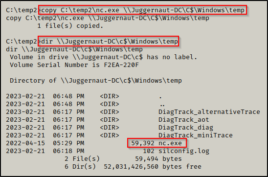 copy C:\temp\nc.exe \\Juggernaut-DC\C$\Windows\temp