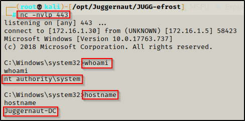 启动 pivot 服务之后提示被挂起,而这是一个好兆头。回到 nc 监听器,我们便获得了一个从 DC 过来的 SYSTEM shell!