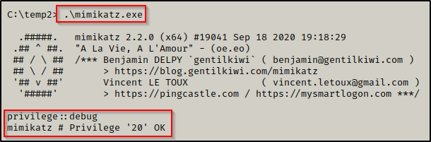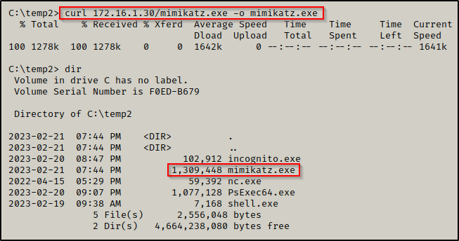 另一个可用于执行令牌模拟攻击的工具是 Mimikatz。首先,我们可以下载 mimikatz.exe 的副本并将其传输到受害机。