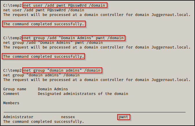 现在,我们已经拥有了域管理员的 Shell,而为了可以非常简单地就切换到 DC,最简便的方法便是创建一个新的域管理员用户。之后,我们就可以通过该用户,使用 psexec.py 获取 DC 上的 Shell;或者,使用 RDP 获取 DC 的远程桌面。