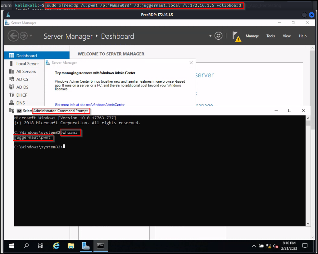 sudo xfreerdp /u:pwnt /p:'P@ssw0rd' /d:juggernaut.local /v:172.16.1.5 +clipboard