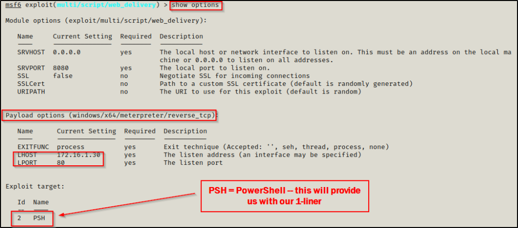 之后,我们执行 exploit 命令,它便会为我们提供一个经过编码的 PowerShell 1-liner 命令字串。