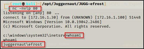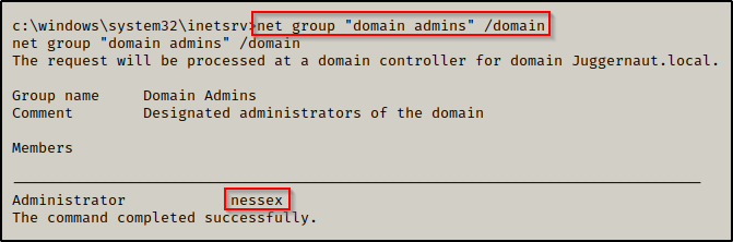 命令执行之后提示挂起,当我们回到 nc 监听器便得到了一个域管理员身份的 shell!