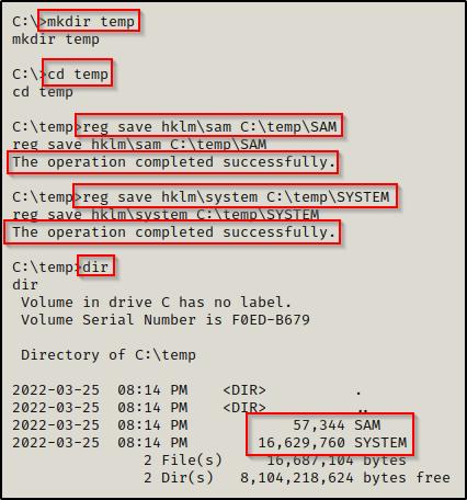 从受害机那里提取 SAM/SYSTEM 文件最简单方法是使用 reg.exe 直接从注册表中提取它们 ,这种技术很简单,通过以下两条命令便能完成: