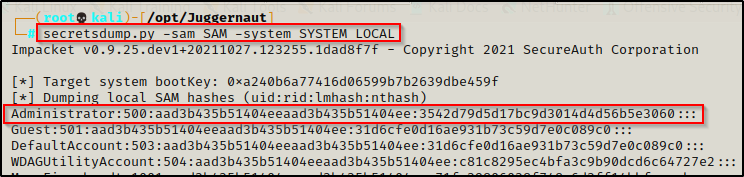 Perfect!我们成功提取到了本地管理员帐户的 NTLM 哈希值,而这也正是接下来的远程攻击攻击所必需的。