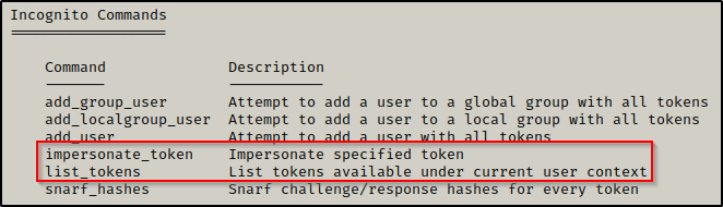 在 incognito 模块支持的命令中,我们最感兴趣的两个命令是 list_tokens 和 impersonate_token。它们允许我们枚举机器上存在的用户令牌,然后模拟我们感兴趣的令牌。