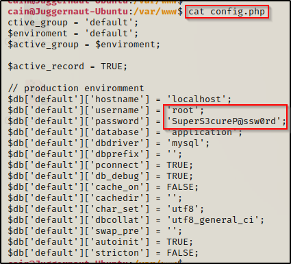 检查 config.php 文件的内容,我们可以看到该文件用于以 root 用户身份访问 MySQL 数据库,文件中还显示了明文用户名和密码!