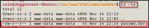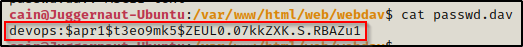 继续在 webroot 中搜索,我们在 /var/www/htmp/web/webdav 目录中找到一个一个名为 passwd.dav 的有趣文件