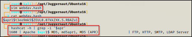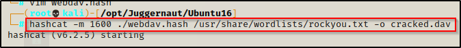 hashcat -m 1600 ./webdav.hash /usr/share/wordlists/rockyou.txt -o cracked.dav