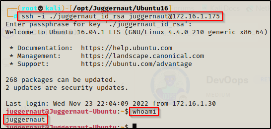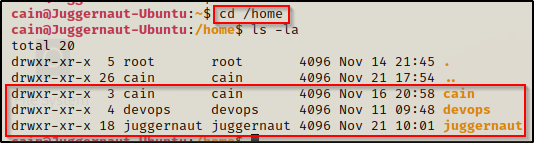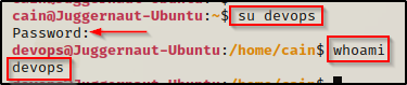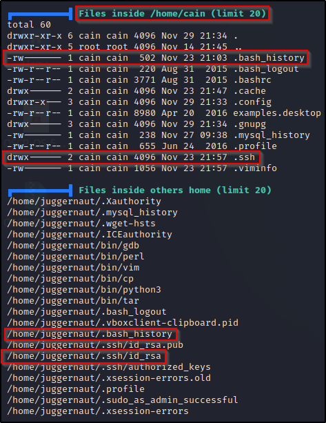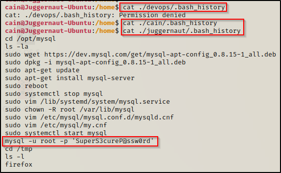 检查了三个 home 配置文件后,我们发现无法查看 devops 用户的 .bash_history 文件;但是,我们可以查看当前用户 cain 和 juggernaut 的!