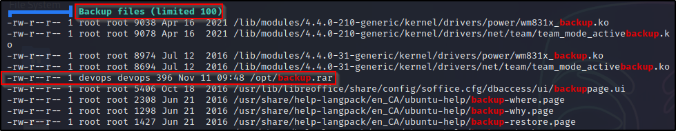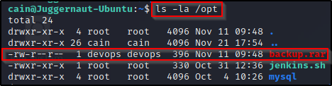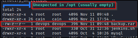 假设在目标机器站稳脚跟后,我们检查公共文件夹中是否存在有趣的文件。当我们检查 /opt 文件夹时,我们发现其中有一个名为 backup.rar 的有趣 RAR 文件 ,该文件属于 devops 用户。