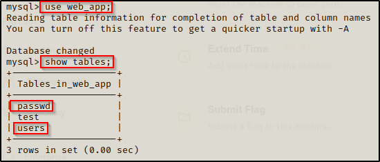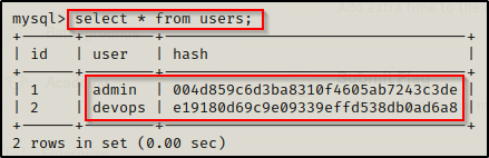 该表有两个用户名和密码哈希值。由于该数据库与网络应用程序绑定,因此破解这些哈希值很可能会让我们以不同用户的身份登录 Web 应用程序。但这也在意料之中,因为密码的重复使用,我们还可以测试其他地方。