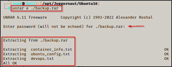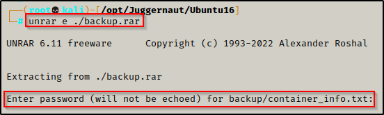 现在该文件已提供给我们的攻击者机器,我们可以尝试使用 unrar 命令和 “e” 选项来提取它。