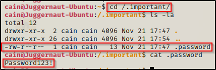 导航到隐藏目录并再次使用 ls -la 命令,我们可以看到有一个名为 .password 的隐藏文件;在里面,我们找到另一个可以添加到密码文件本中的密码。