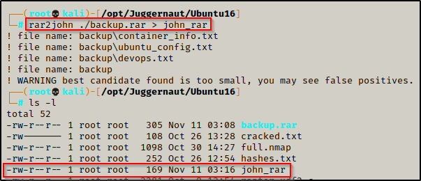 由于我们尝试破解的是 RAR 文件,因此我们可以使用 rar2john 将 RAR 文件转换为可破解的格式。
