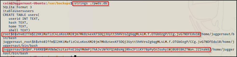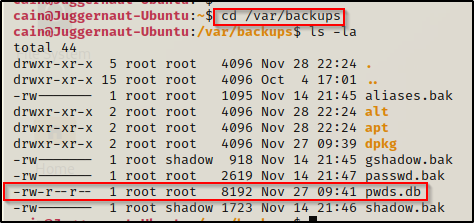 我们可以看到所有默认文件(如 passwd 和 shadow 备份)都被锁定并归 root 所有(即只有 root 有权查看)。但是,我们可以看到这里有一个 db 文件,这种类型的文件通常是由 Sqlite3 构建的包含表、列和行的数据库。