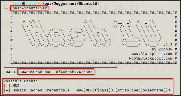 这里我们可以看到可能的哈希值为 MD5 或 MD4 域缓存凭证。由于这不是 Windows 机器,因此可以肯定这些是MD5。