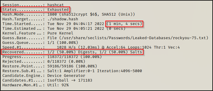 hashcat -m 1800 ./shadow.hash /usr/share/seclists/Passwords/Leaked-Databases/rockyou-75.txt -o shadow.cracked