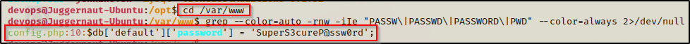 我们通常会在 webroot 目录中找到凭证(通常是连接 MySQL 数据库的帐户密码)。一般情况下,webroot 目录总是位于 /var/www,其中还包含我们在获得立足点之前使用 gobuster 或 dirb 等工具对子目录进行模糊测试时找到的网页。