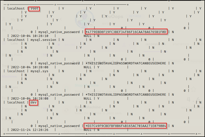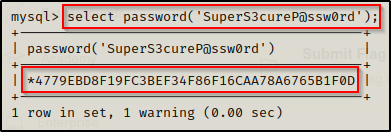 此命令会将传递的字符串转换为哈希值。可以看到,user 表中 root 用户的密码哈希与我们用于登录 MySQL 的密码的哈希是相同的。但是,我们找到的 dev 用户的哈希是唯一的,因此我们可以将此哈希复制到攻击者机器上的 TXT 文件中,然后使用 hashcat 对其进行破解。