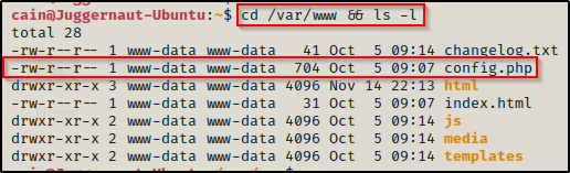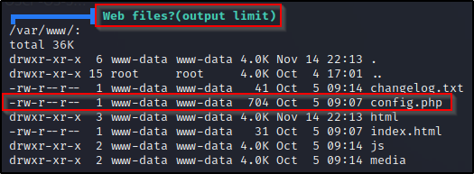 导航到 /var/www/ 我们可以看到这里有几个文件,但最引人注目的是 “config.php”。