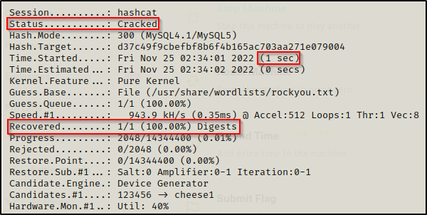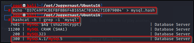 hashcat -m 300 ./mysql.hash /usr/share/wordlists/rockyou.txt -o cracked.txt