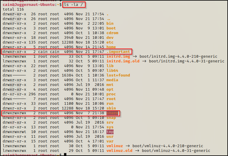 这里我们可以看到文件系统根目录中有两个非标准文件夹,其中一个是隐藏文件夹:.important