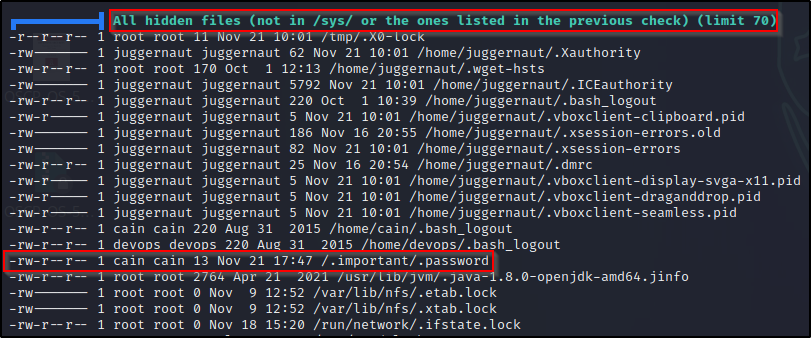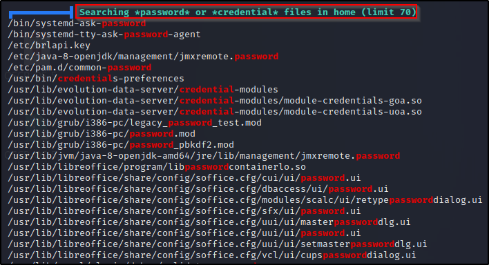 我们可以看到 LinPEAS 的搜索非常有针对性,因此输出结果并不多。对于文件名中有趣的字符串,LinPEAS 只有以下子部分:Searching password or credential files in home (limit 70)。虽然它说的是“在 home 目录中”,但它实际上会检查整个文件系统。遗憾的是,70 的限制有助于减少输出结果,但它也遗漏了许多潜在的可能。