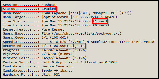 我们发现此哈希类型的破解模式是 1600,可以将其插入以下命令以开始破解此哈希。