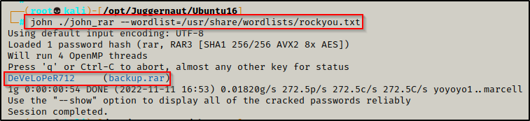 john john_rar --wordlist=/usr/share/wordlists/rockyou.txt