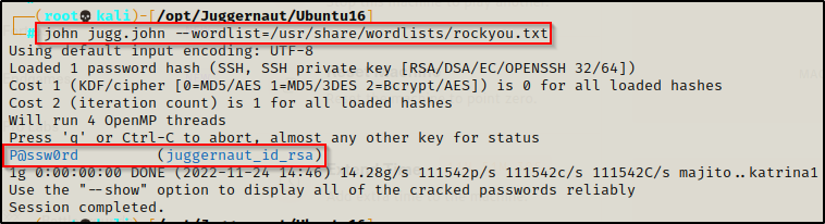 将输出重定向到文件后,我们现在可以尝试使用 John 和 rockyou.txt 单词表来破解密码。