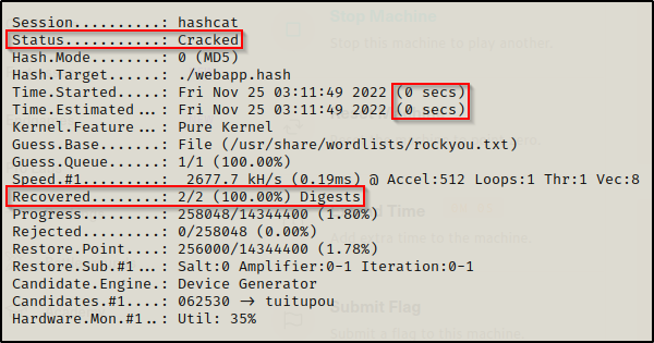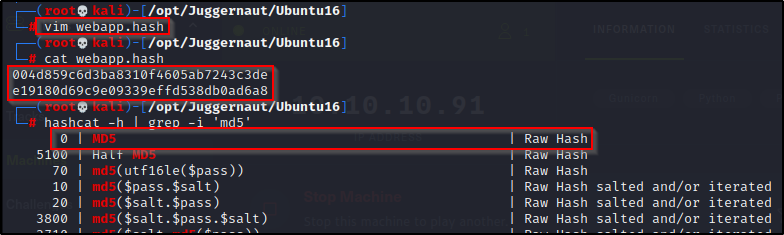hashcat -m 0 ./webapp.hash /usr/share/wordlists/rockyou.txt -o webapp_cracked.txt