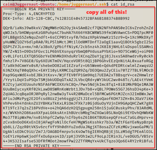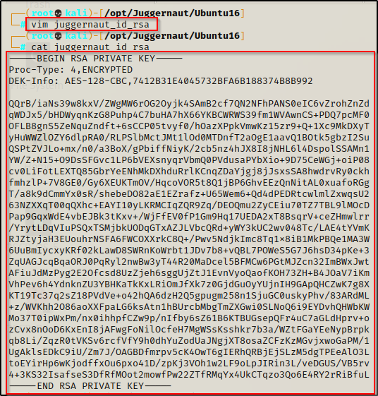 尝试查看每个用户的 bash 历史文件的内容时,我们在自己的文件中没有发现太多值得关注的内容,但是在 juggernaut 里发现了一些有趣的东西。